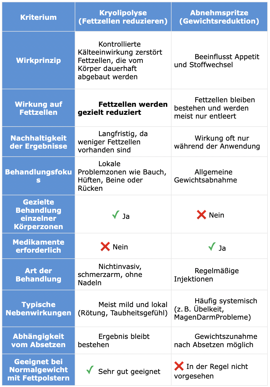 Ein entscheidender Vorteil der Kryolipolyse gegenüber der sogenannten Abnehmspritze liegt im Wirkprinzip: Während Abnehmspritzen in erster Linie den Appetit beeinflussen und Fettzellen lediglich entleert werden, zielt die Kryolipolyse direkt auf die Fettzellen selbst ab.